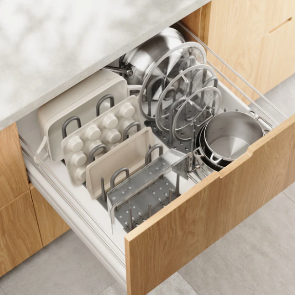 - Spíž / kuchyně: Ideální jsou drátěné police – umožňují cirkulaci vzduchu a umožňují snadné čištění rozlitých látek. Přidejte vložky do polic pro malé předměty.